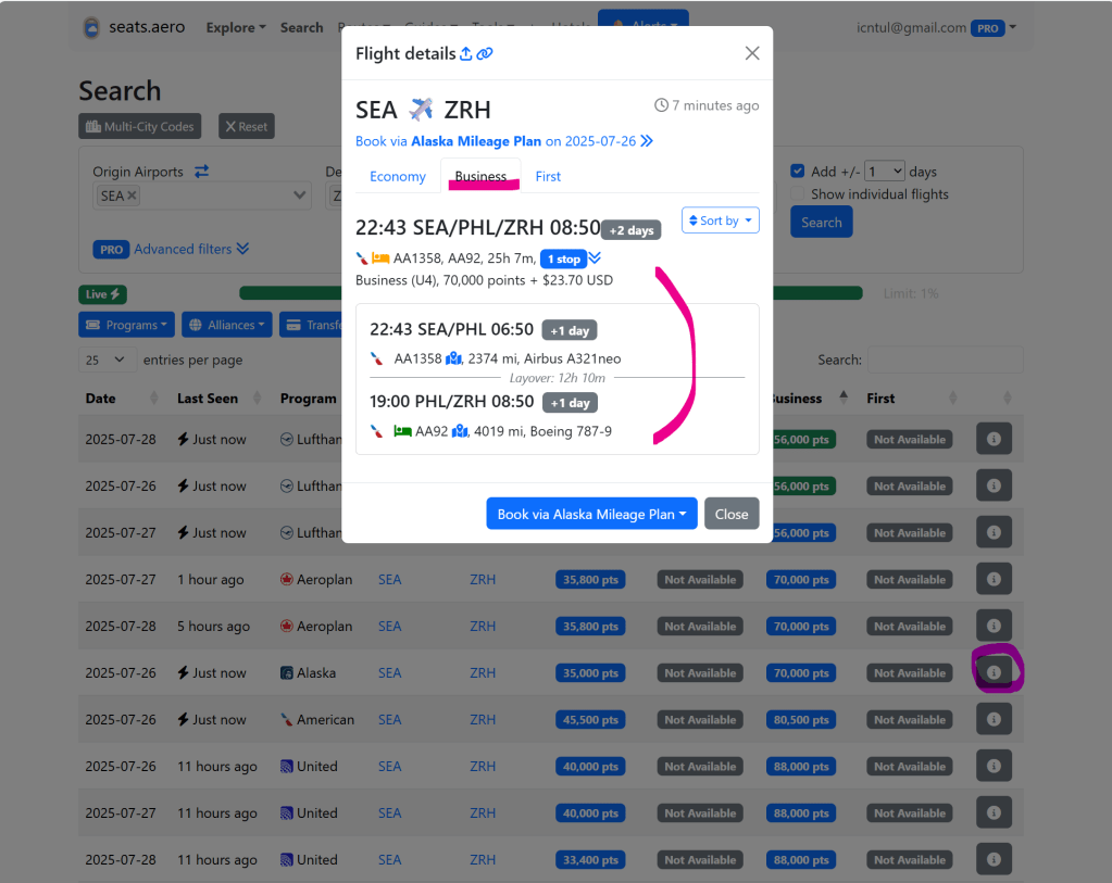 7월말 8월초 성수기임에도 불구하고 Seats.aero 덕분에 비교적 손쉽게 비지니스 마일리지 항공권을 검색하고 발권할 수 있었습니다.